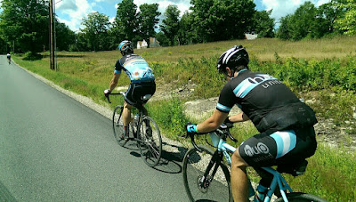 We rolled out at 8 am. We got absorbed by a fairly largish group of masters type riders. Some with sleeveless jerseys which always makes me very nervous. Some odd bike choices. And they seemed to be very hyped. I wasn't that comfortable. So when we hit the first dirt sector through a corn field I hit the gas to get away from them. In doing so I must have hit a rock or something and gashed open the small puncture that was already in my front tire. I mean Stan's starts shooting out of the tire. In alarming volume and rate of speed. Granted its probably because we are rolling at 25 mph but I am getting sprayed with Stan's. As is the bike. Then it would seal. Then it would rip open. Rinse and repeat for the next 15 miles. I was in equal parts denial and equal parts not wanting to stop. We were rolling at a good pace and feeling fresh. Stopping always messes with your flow. Especially early on. But I was starting to worry about the front tire failing on a descent. So on River Road I pulled the plug and pulled over to put a tube in. Stan's is disgusting. There I said it. Putting a tube into a tubeless tire is NBD but it is messy. I dumped what sealant I could out. Pulled the valve out. Booted the tire. Tube in and we were on our way in under 10 minutes. Rosey was a big help getting the bead on right and making sure I hadn't messed up the tire any worse than I had.